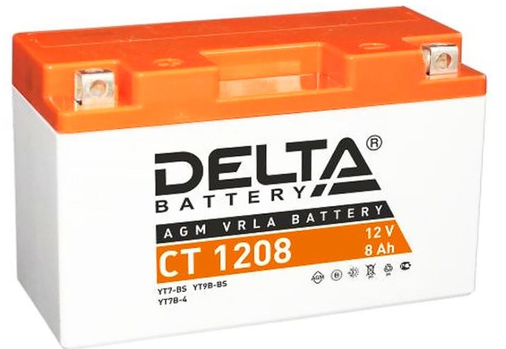 Аккумулятор Delta CТ1208 12V8Ah. Герметичная необслуживаемая свинцово-кислотная аккумуляторная батарея VRLA (AGM). Предназначена для пуска двигателей различной малокубатурной мототехники. Соотв. стандарту YT7B-BS, YT7B-4, YT9B-BS