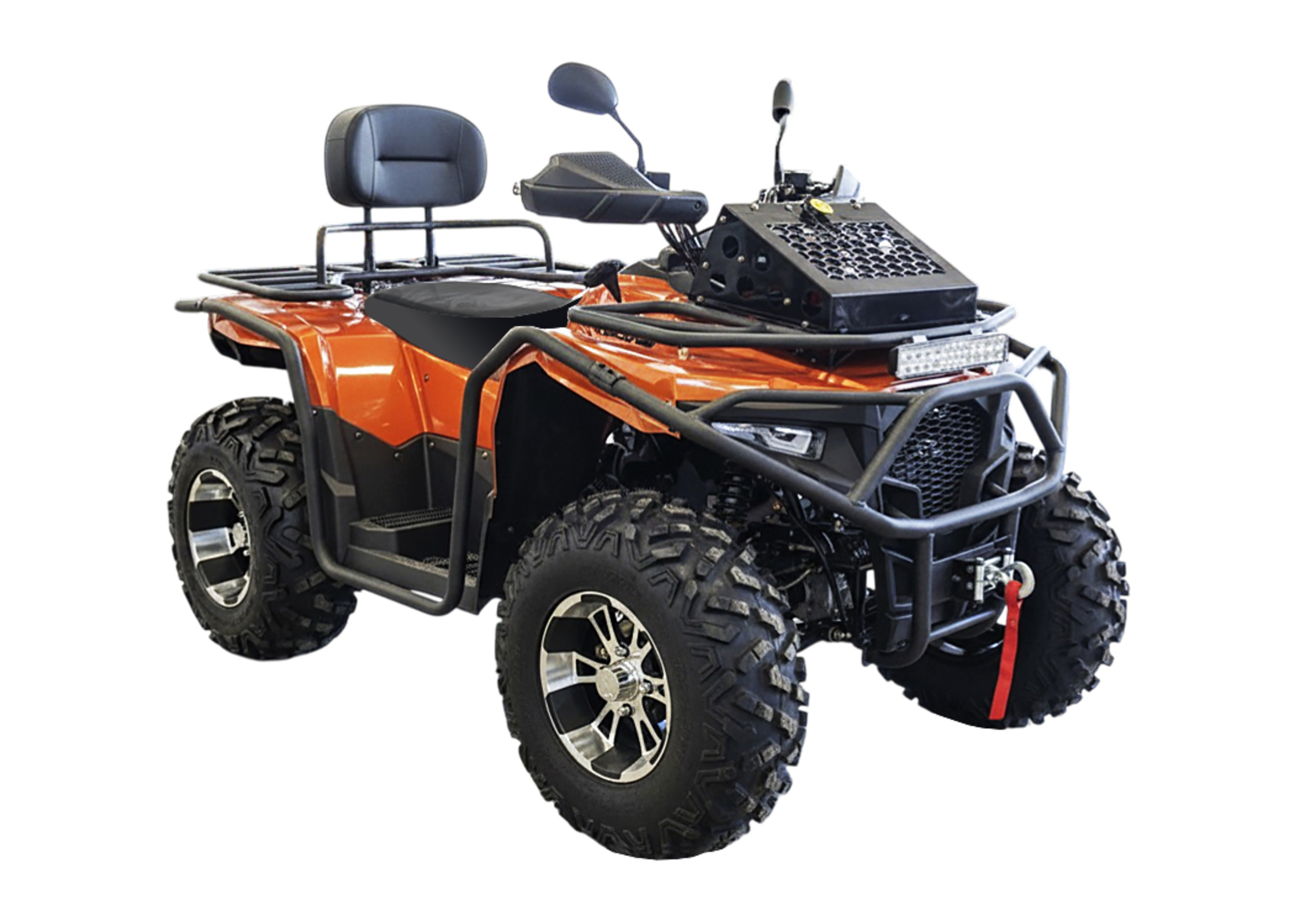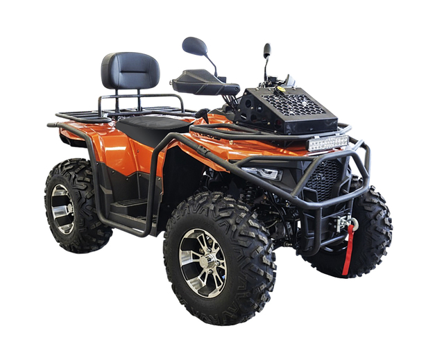Отдельное внимание уделено оснащению: уже в базовой комплектации предусмотрены лебёдка с дистанционным управлением, защита по кругу, подогрев руля, фаркоп, яркая LED-оптика и дополнительный свет. Квадроцикл готов к работе сразу после покупки — без необходимости дооснащения.