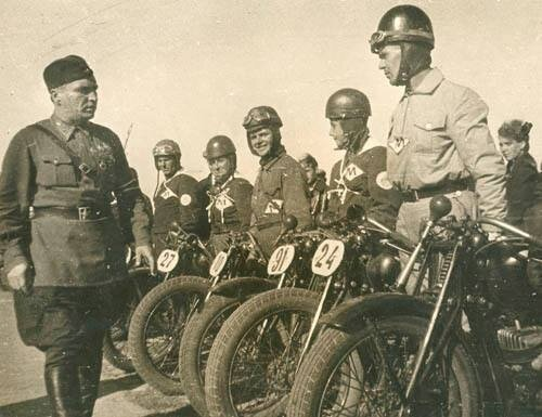 Комбриг Валерий Чкалов принимает парад участников Всесоюзных авто-мотосоревнований на Первенство СССР в Киеве осенью 1937 года. Фото из личной коллекции Андрея Мятиева, основателя Музея истории велосипедного дела.