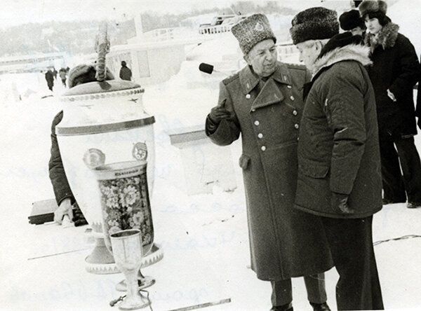 Генерал-полковник авиации Георгий Филиппович Байдуков (член экипажа Чкалова во время рекордных перелетов 1937 и 36 годов) и Анатолий Васильевич Ляпидевский возле Переходящего Приза Чкаловского Мотокросса зимой 1981 года. Фото из личной коллекции Андрея Мятиева, основателя Музея истории велосипедного дела.